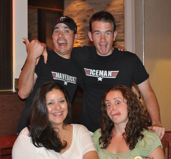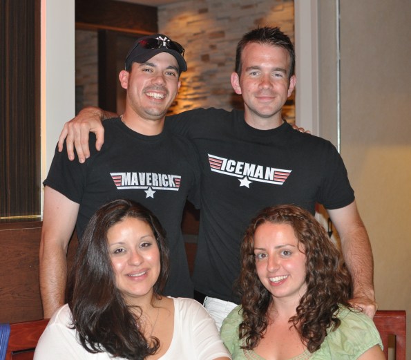 We all met up at a Japanese Hibachi place. Chris and I made sure to wear out matching shirts. See, a few years back, Chris and I dressed up as characters from Top Gun for Halloween – I was Iceman, and he was Maverick.