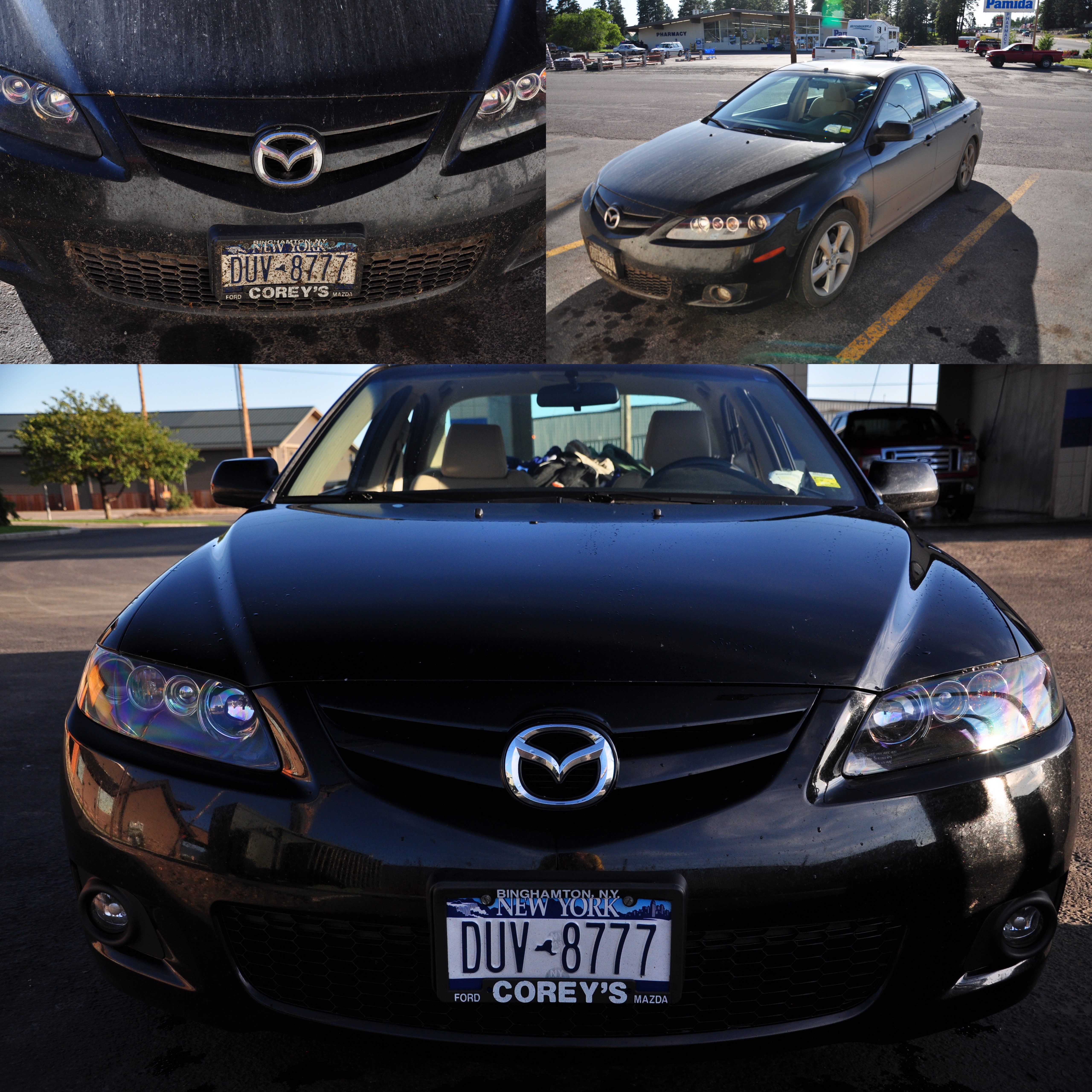 By early afternoon I had exited the park, and being a bit tired, I stopped at a cafe not far from Kalispell.  It was there I realized how very dirty the car was.  The Mazda hadn’t received a wash since Alaska, and over a week’s worth of dirt, bugs, and grime had taken their toll.  I was able to find one of those coin-operated car washes and spent a lot of extra quarters working to get the dead bugs off the front.  Here you can see the before and after: