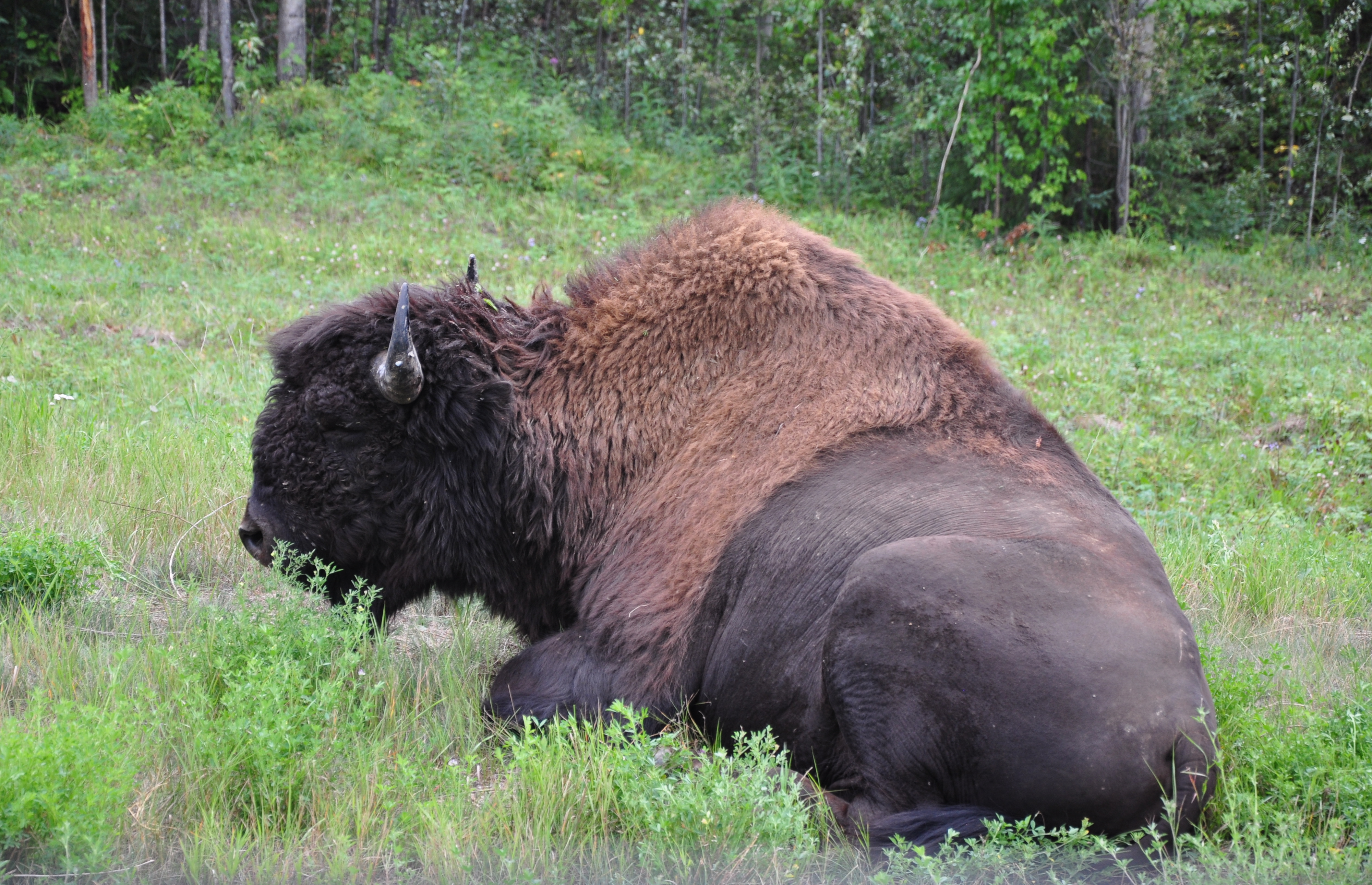 Not long later in the drive I encountered another bison. This one was well off the shoulder, however, lying in the grass. So I’ve seen a good amount of wildlife (as promised), and there’s a lot left to my time on the Alaska Highway. So far: caribou count – 5, bison – 2