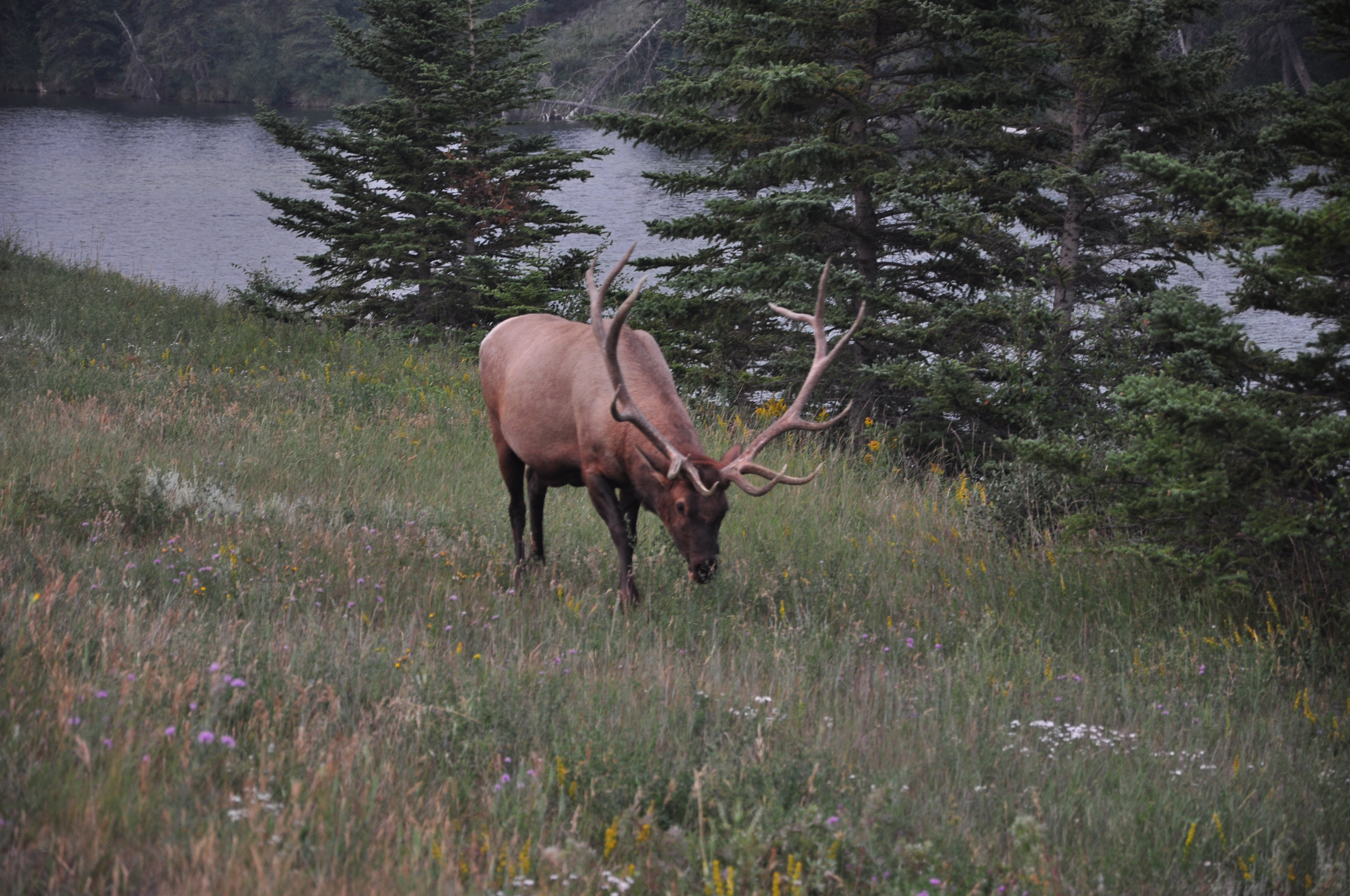 By the time I reached the northern section of Jasper, the air was still hazy and mountains were just blue-ish outlines in the sky. But oh well. Not long after entering the park, I noticed some cars pulled over on the side of the road. Turns out there was a giant elk just hanging out on the side of the road.
