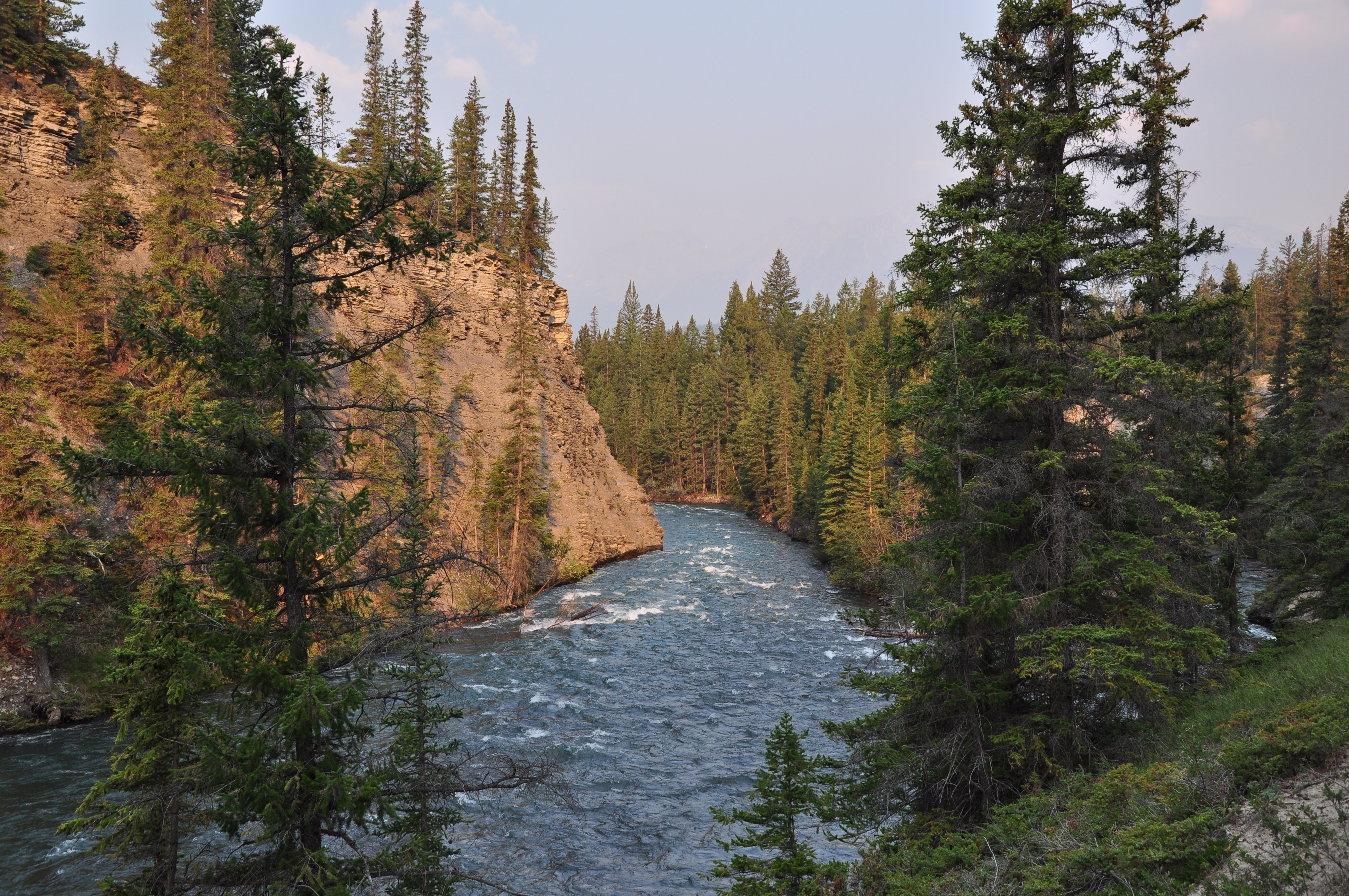 I made for the village of Jasper, which is right in the heart of the park. There I wandered around a bit to stretch the legs. Before I knew it, it was 10PM, and I was pretty beat. Had a good night’s rest (a lot less light to deal with than the prior night’s sleep), and then around 7AM I made my way to the Maligne (for those who know French – how would you pronounce that? I have no idea) River Canyon to get an early-morning hike in. The air was a little less hazy than the day before, and it was quiet – didn’t see anybody out until probably after an hour of walking.