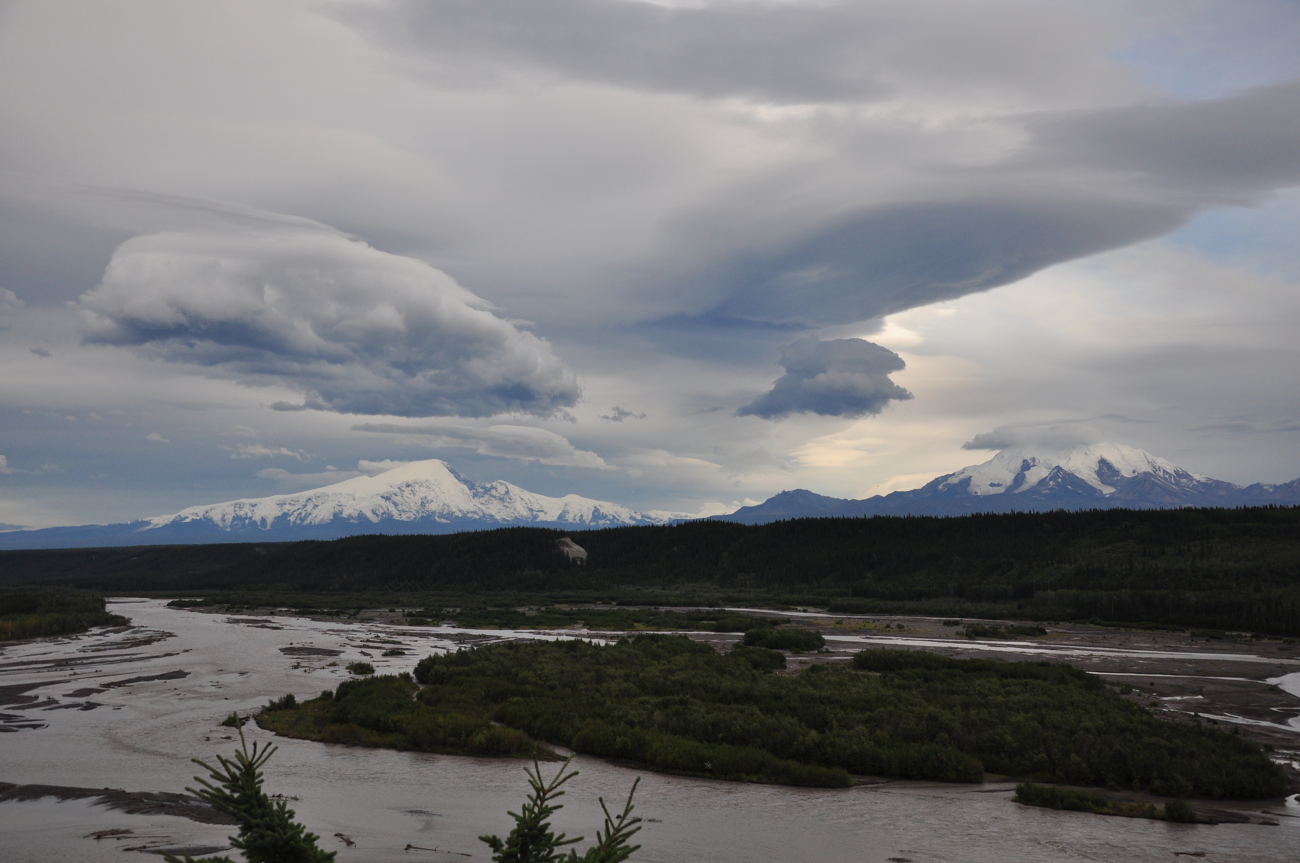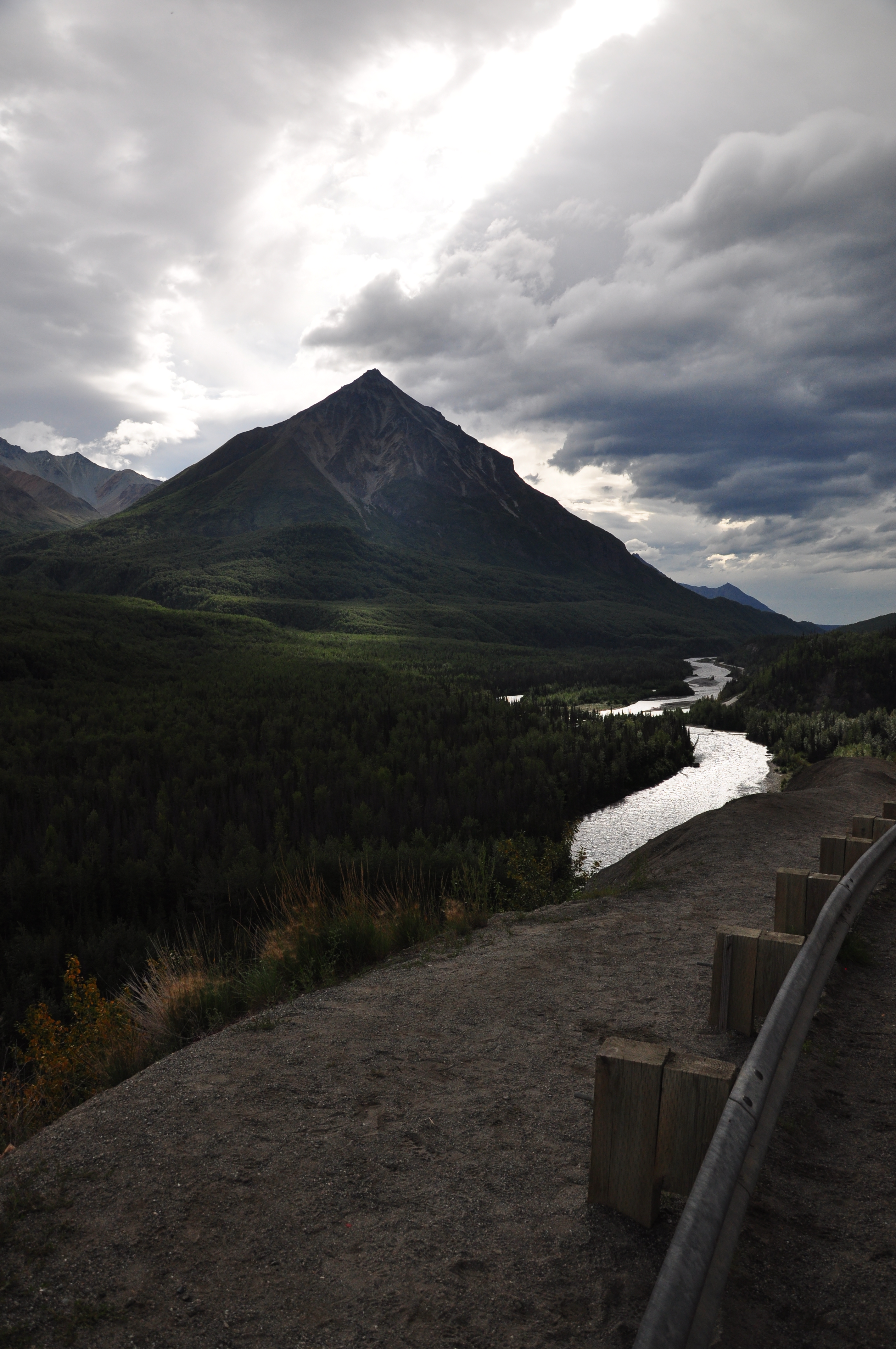 The going was a bit slow getting out of the Palmer city limits, as there were some pull-offs to take in some of the nice views, and there was a Musk Ox farm on the way. Unfortunately, the cost to see the musk oxen up close was $8, and the animals didn’t appeal enough to me to pay $8. Also, I had felt some nausea and ready to puke (I suspect something was up with the grapes I had purchased the previous day). But an hour napping off by a river helped alleviate that a bit.